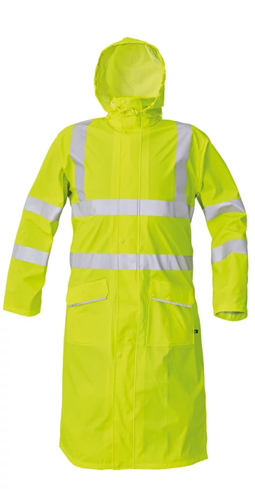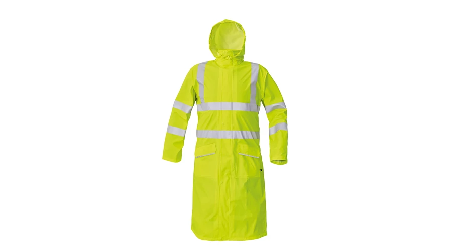 • vízálló és szélálló bőszabású esőkabát gallérba hajtott kapucnival • 120 cm hosszú • zsinórral megköthető kapucnival • kettő széles mellső zseb hajtókával védve a víz bejutásától • az ujján patenttal állítható