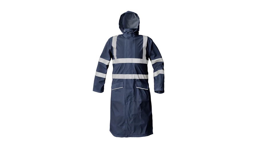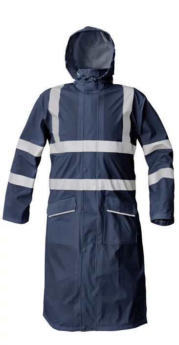 • vízálló és szélálló bőszabású esőkabát gallérba hajtott kapucnival • 120 cm hosszú • zsinórral megköthető kapucnival • kettő széles mellső zseb hajtókával védve a víz bejutásától • az ujján patenttal állítható