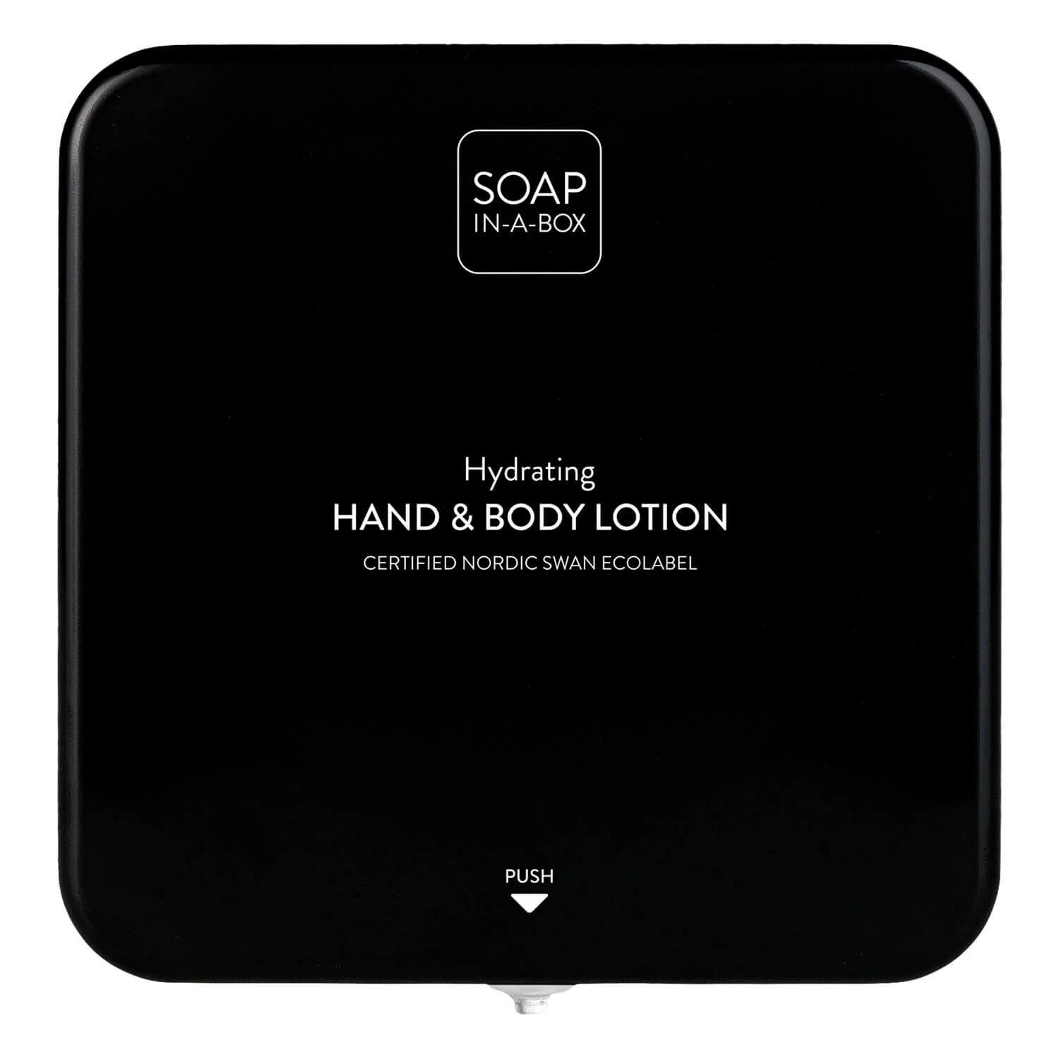 Soap-In-A-Box fényes fekete kéz- és testápoló adagoló, előlap