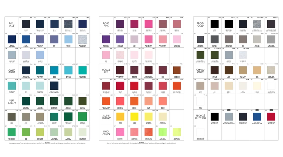 A színkatalógus válogatott, vágott szövetmintákat tartalmaz, amelyek segítségével a termékek színei valóságban is megtekinthetők. A képernyőn megjelenő árnyalatok a monitor beállításaitól és minőségétől függően eltérhetnek a tényleges színektől, ezért az online megjelenítés nem minden esetben ad pontos képet.