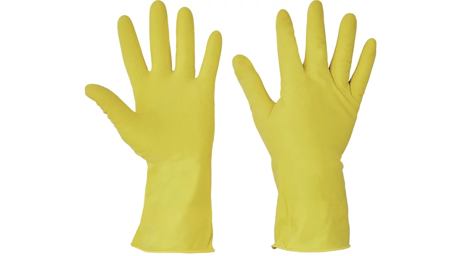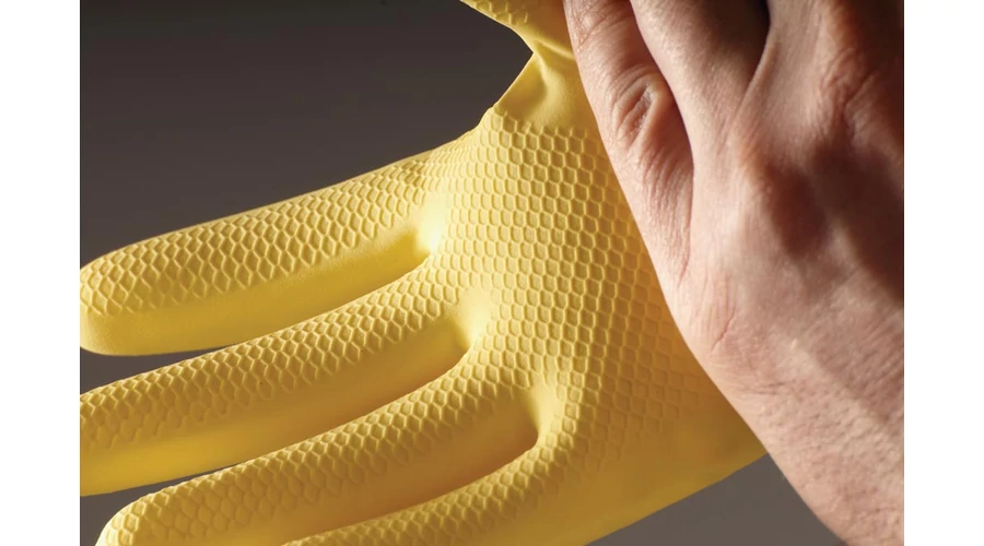 Velúrozott belsejű latex kesztyű csúszásgátló kikészítésű tenyérrel és ujjakkal.