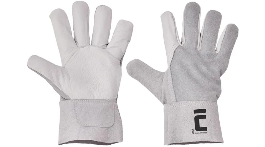 Világos színmarhabőr tenyerű és szürke hasított marhabőr kézhátú, bélés nélküli kesztyű merev, 7 cm széles mandzsettával