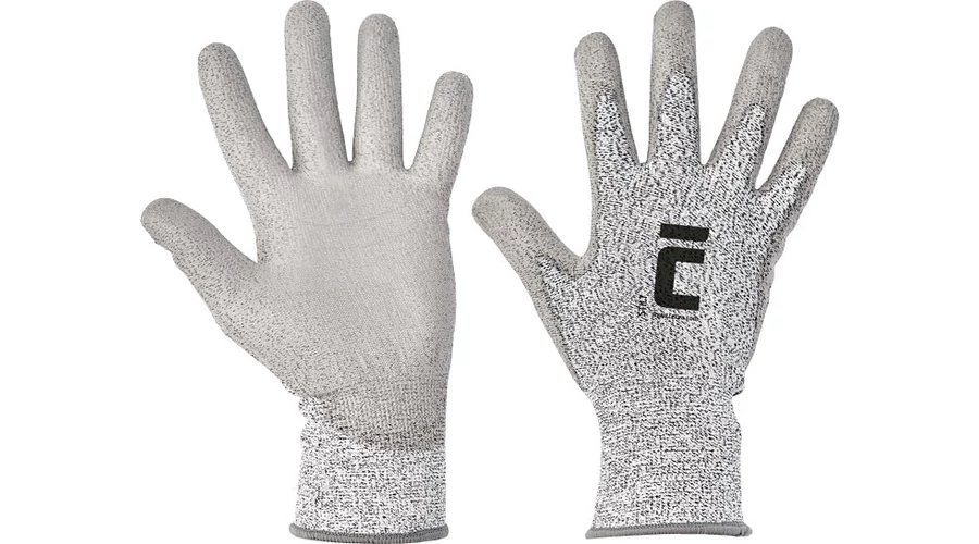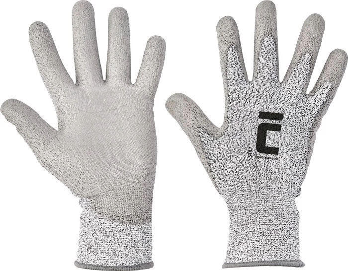 Kötött kesztyű, vágásbiztonsága B3-as szintű. Tenyéren szürke PU mártással.