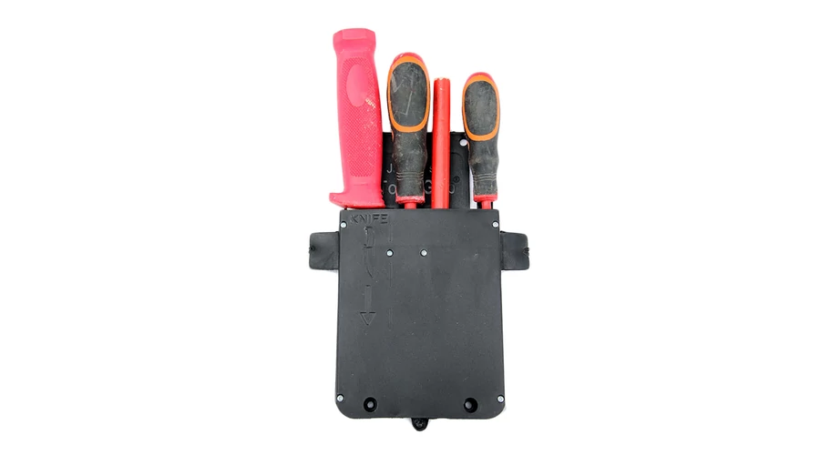 A biztonsági szerszám tartó egy olyan szabadalmaztatott megoldás, amely a kéziszerszámokkal végzett munka során javítja a munkahely biztonságát és hatékonyságát. A szabadalmaztatott gumifogak lehetővé teszik, hogy a felhasználó akár négy különböző szerszámot is biztonságosan tartson, miközben minimalizálja a leesés kockázatát.