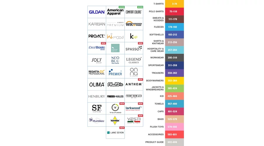 A katalógus a promóciós és vállalati ruházat legszélesebb választékát kínálja, beleértve a klasszikus pólókat, galléros pólókat, pulóvereket, kabátokat, nadrágokat és kiegészítőket, valamint sportruházatot és professzionális munkaruhákat.
