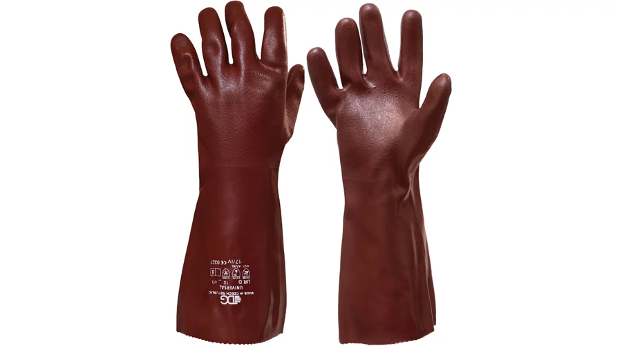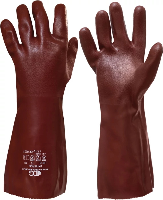Universal modellen alapuló kesztyű, amelyet kétszer mártottak, másodszor sűrű PVC+szemcse szuszpenzióban, így növelve a kesztyű csúszásgátló tulajdonságait