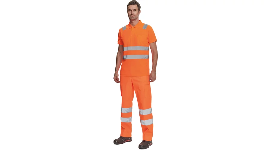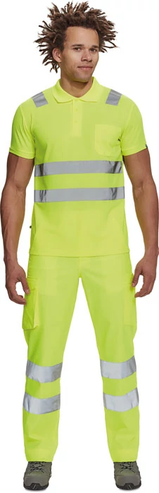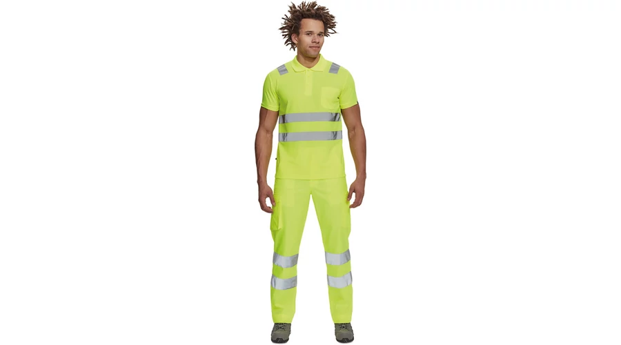 férfi munkanadrág 7 cm széles fényvisszavető csíkokkal és Hi-Vis elemekkel; 2 oldalsó zseb + 1 érmezseb; 2 oldalzseb; 2 hátsó zseb; rugalmas oldalsó betétek a derékon; meghosszabbítható szárhossz